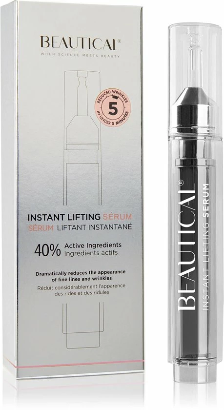 De formule richt zich op de meest dynamische rimpels in het gezicht – voorhoofdsrimpels, kraaienpootjes en nasolabiale plooien – maar het serum geeft ook dramatische resultaten bij wallen onder de ogen. Door de huid op te vullen en de diepste lagen te hydrateren, vermindert BEAUTICAL Instant Lifting Serum de wallen voor een steviger, stralend uiterlijk.