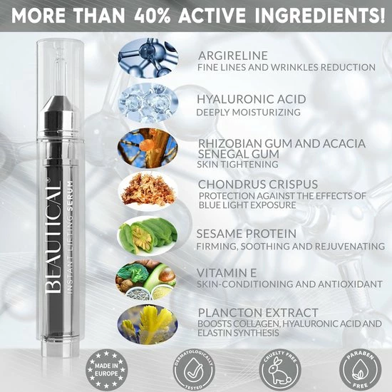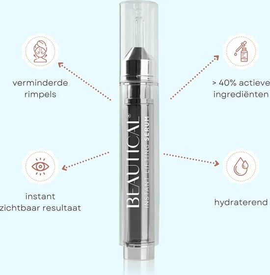 BEAUTICAL Instant Lifting Serum werkt goed op kraaienpootjes, expressierimpels of nasolabiale plooien. Het zorgt ook voor een verjonging van de blik en vermindert de wallen onder de ogen!