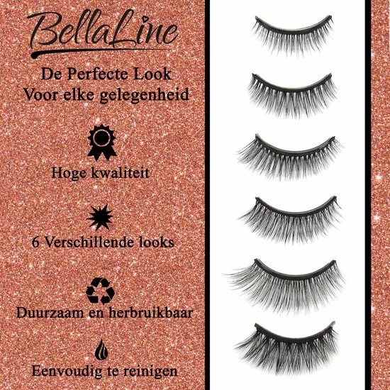 Dankzij de hoge kwaliteit ogen de nepwimpers zeer natuurlijk. Het 3D-effect zorgt bovendien voor volumineuze wimpers. Je ontvangt een set van 6 verschillende magnetische wimpers zodat je voor elke gelegenheid de juiste look kunt cre?ren. Van een subtiele naturel look tot een echt va-va-voom effect: met de 6 verschillende wimper extensions van BellaLine kan het allemaal.