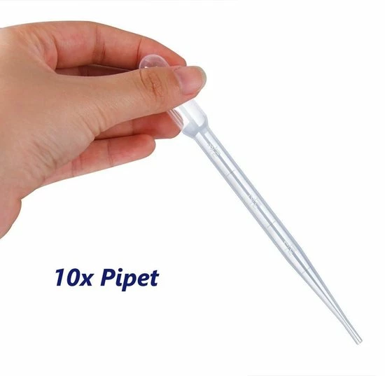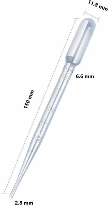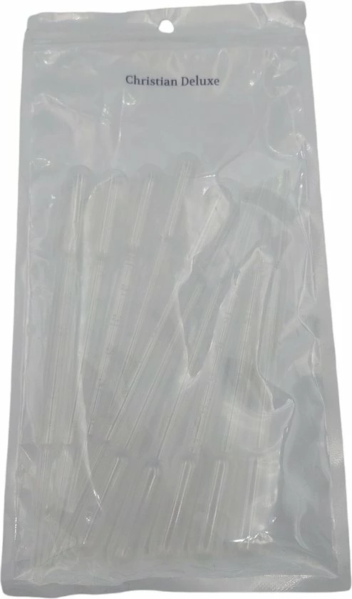 Christian Deluxe levert de pipetten in een verpakking van 10 stuks, hebben een afmeting van 1.8 cm breed en 15 cm lang. Het tuitje van de pipet is 2.8 mm.