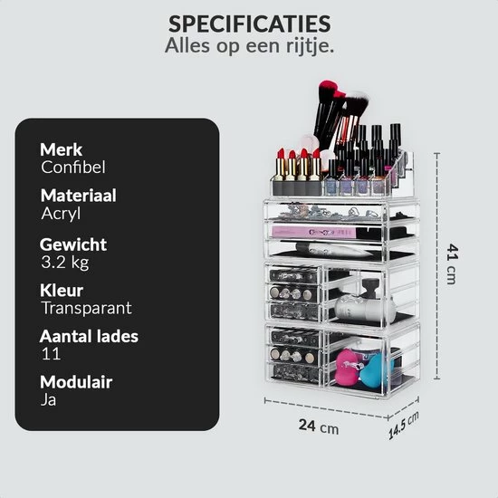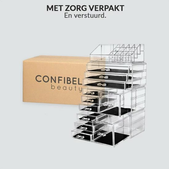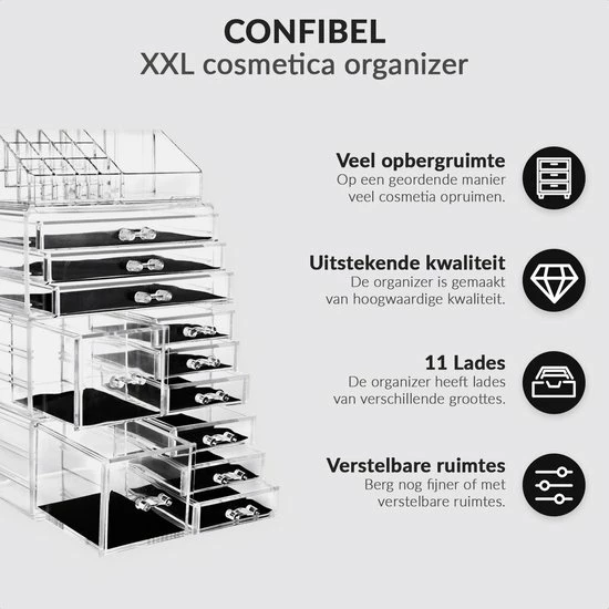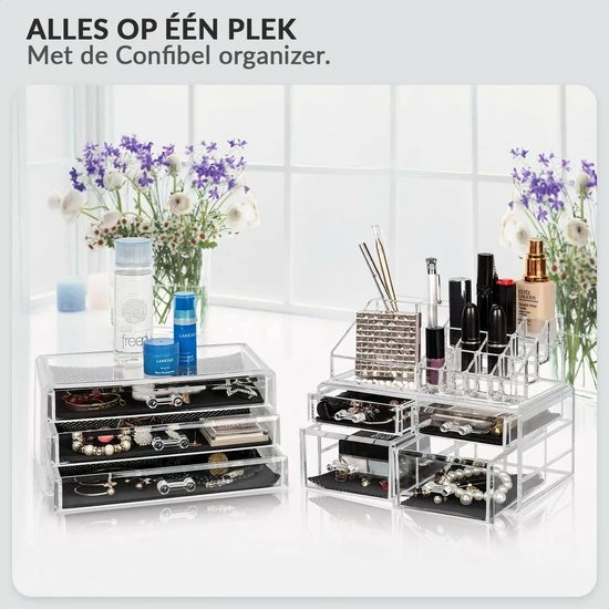 Wil je op een nette en handige manier je make-up en beautyproducten opbergen? Deze organizer van Confibel biedt jouw alle ruimte die je nodig hebt. De organizer is niet alleen praktisch, maar ziet er ook nog eens mooi uit. De houder staat bekend als make-up organizer, maar kan tevens ook voor vele andere doeleinden gebruikt worden. De organizer is makkelijk te verplaatsen. Daarnaast kan de organizer als mooie eyecatcher staan bij jouw make-uptafel, kast of bureau. Tot slot is de organizer eenvoudig met een doekje schoon te maken.