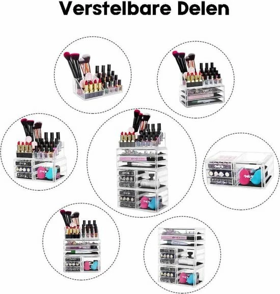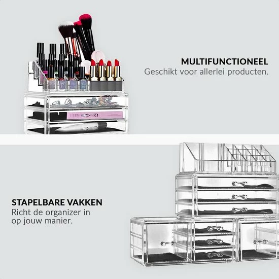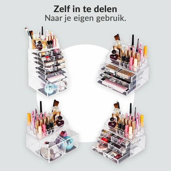 Deze organizer kan in iedere vorm opgestapeld worden naar jouw wens. Hij is in in iedere ruimte te gebruiken aangezien je hem in verschillende delen kan splitsen. Zo kan je er een grote make-up organizer van maken maar je kan hem ook in meerdere delen splitsen voor kleinere ruimtes. Dit zorgt ervoor dat je alles netjes kan indelen.