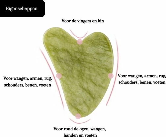 Deze schraper is gemaakt van Jade. Jade is een bijzondere edelsteen die van oudsher wordt gebruikt bij Oosterse schoonheidsrituelen. De Jade edelsteen heeft veel positieve effecten voor je mentale en fysieke gezondheid. Goed gebruik van deze Gua Sha Schraper zal voor wonder resultaten zorgen.