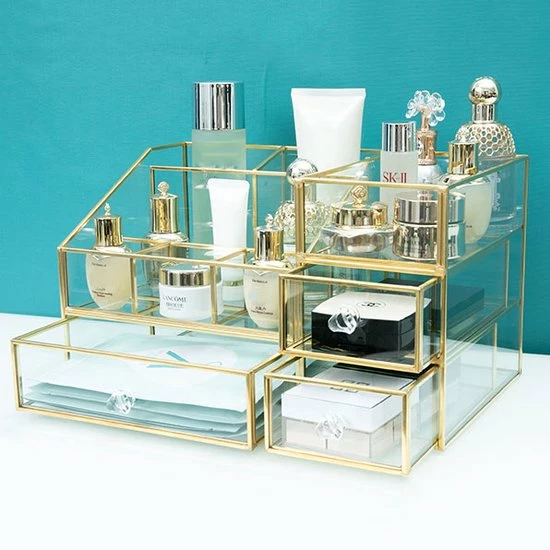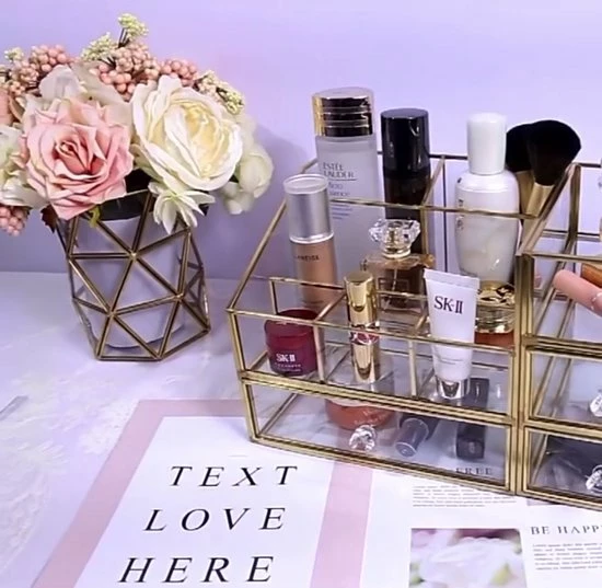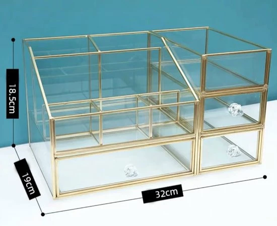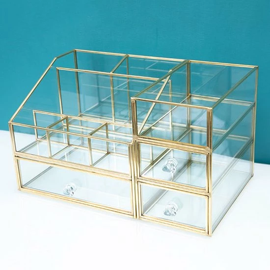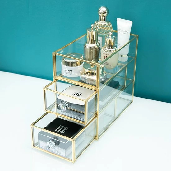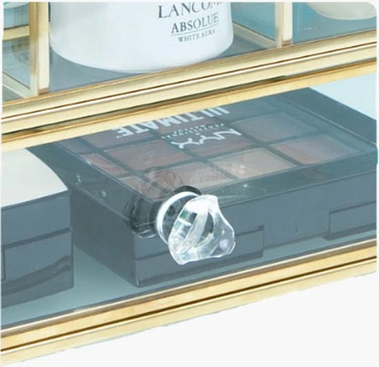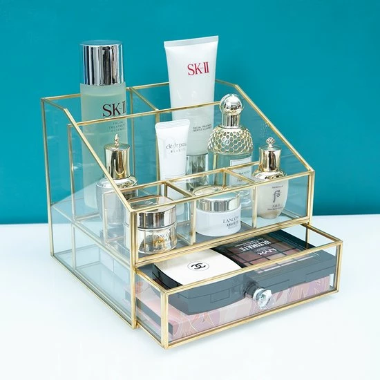 Ben je op zoek naar de ideale make-up/sieradendoos, dan is deze organizer perfect voor jou! Deze organizer met messing frame beschikt over 6 vakjes waar je make-up, make-up kwasten, nagellak en luchtjes in kunt zetten. Daarnaast heeft het 3 lades voor sierradenof make-up producten. De beautybox is in 2 delen te verdelen. Door het transparante design, kun je in één oogopslag jouw producten en sierraden zien en het ook stijlvol en geordend opbergen. De verfijnde afwerking zorgt voor een luxueuze uitstraling. Deze make-up/sieradendoos is dan ook onmisbaar op jouw make-up tafel of in een beautysalon.