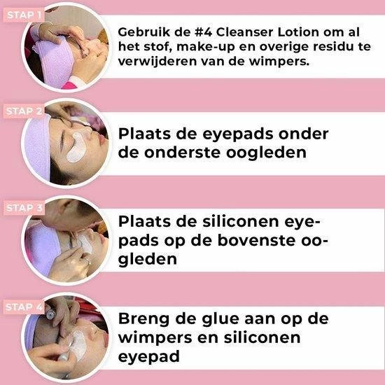 - Het belangrijkste is dat de bijgeleverde lift pads (liftkussentjes) en de wimperhaartjes goed vetvrij zijn. Dit is essentieel voor het resultaat. Hiervoor gebruik je de Cleanser #4.