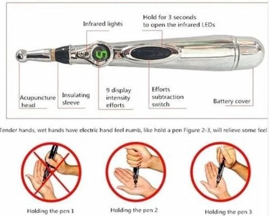 De elektrische acupunctuur-pen werkt zonder de huid te beschadigen. Volledig veilig, effectief en eenvoudig te gebruiken.