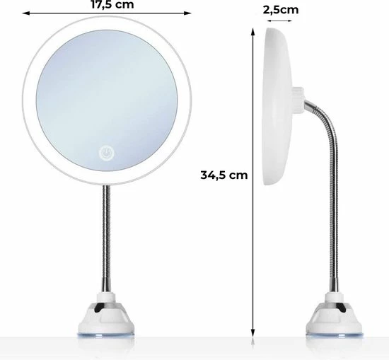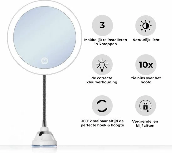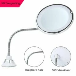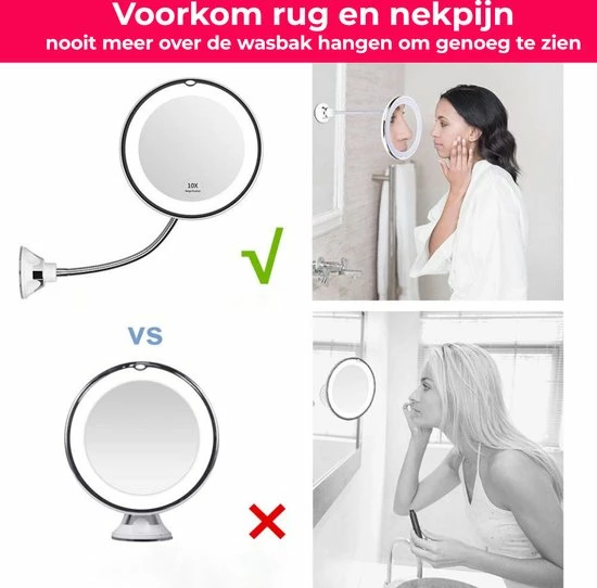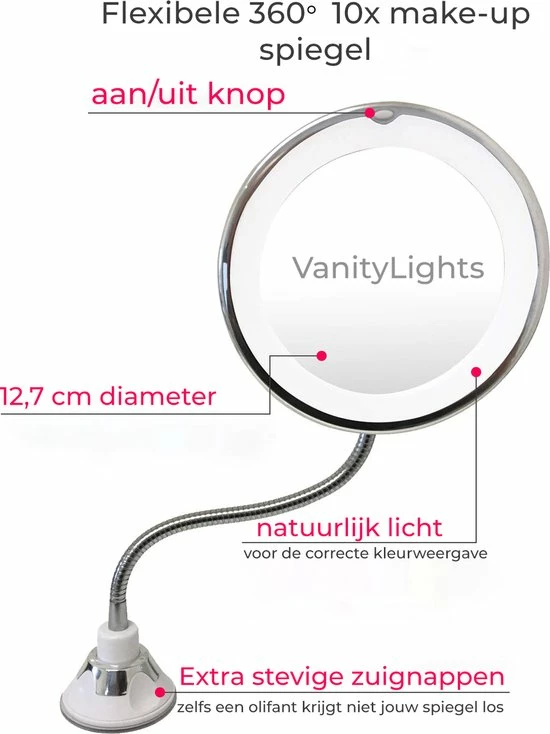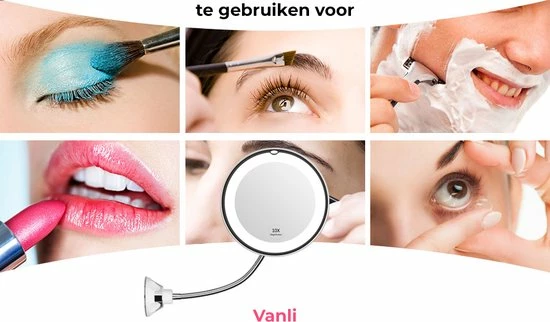 Wij geloven dat goed uitzien begint bij goed verzorgen. Van je make-up opdoen tot haren verzorgen. Zie de kleinste details. Met de flexibele 10x vergroting make-up spiegel van Vanli. De flexibele spiegel zorgt ervoor dat je altijd de juiste hoek & belichting hebt. Verstel. Pas aan. En voorkom lelijke mee-eters, puistjes of vergeten haartjes.