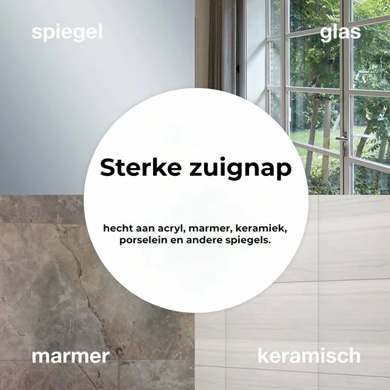 *Hecht zich aan oppervlakken zoals acryl, marmer, keramiek, porselein en andere spiegels. Vermijd stucwerk, gipsplaten, behang en andere gestructureerde muren.