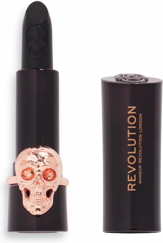 De ultrazwarte lipstick is vernieuwd, mét een goudkleurige doodshoofdring om jouw Halloween outfit af te maken. Deze Midnight Kiss lipstick heeft een 3D reliëf met een skull print en een smooth velvet finish.