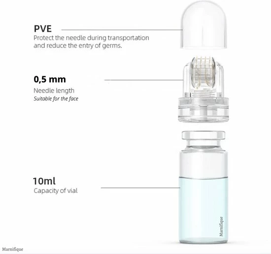 - Gebruik alleen een mild gezichtsproduct als vloeistof in de derma roller om de huid niet te irriteren. Denk bijvoorbeeld aan; vitamine C-serum, vitamine E of hyaluronzuurserum.