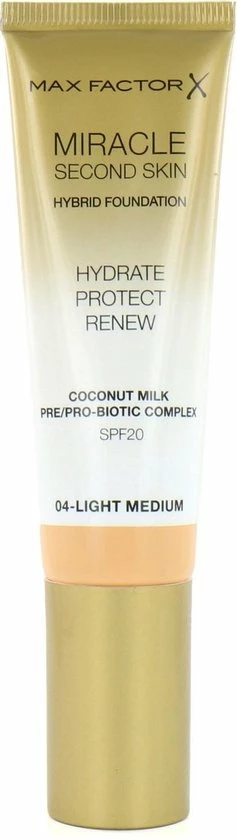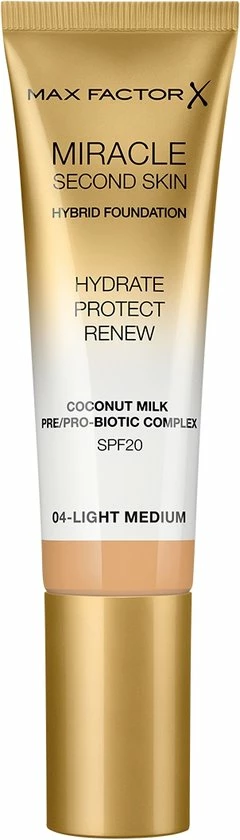 Max Factor Miracle Second Skin Foundation vervaagt imperfecties en geeft de huid een egale teint. Tegelijkertijd levert het bescherming en is de foundation verrijkt met huidvriendelijke voedingsstoffen zoals kokosmelk, glycerine en alo? vera. De Max Factor Miracle Second Skin Foundation helpt de huid in balans te brengen en maakt de huid net zo mooi als de binnenkant!