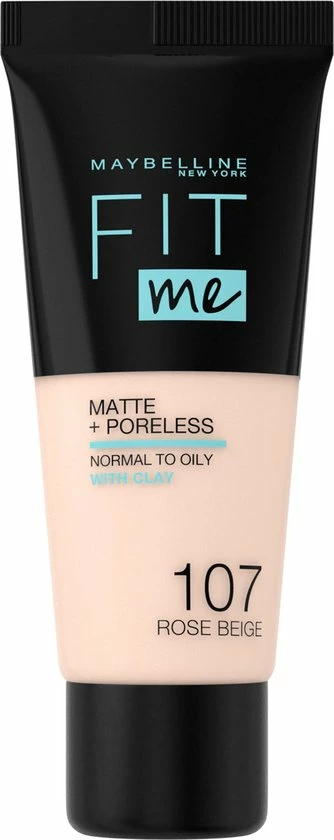 Maybelline New York Fit Me Matte & Poreless Foundation 107 Rose Beige is een medium dekkende foundation die moeiteloos kleurt met de textuur en kleur van de huid voor een natuurlijk ogend resultaat.