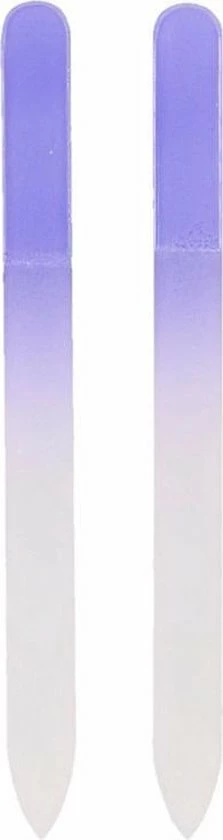 Glazen nagelvijl paars. Deze glazen nagelvijlen hebben per stuk een formaat van ongeveer 14 cm en zijn verpakt per 2 stuks. Kleur: paars.