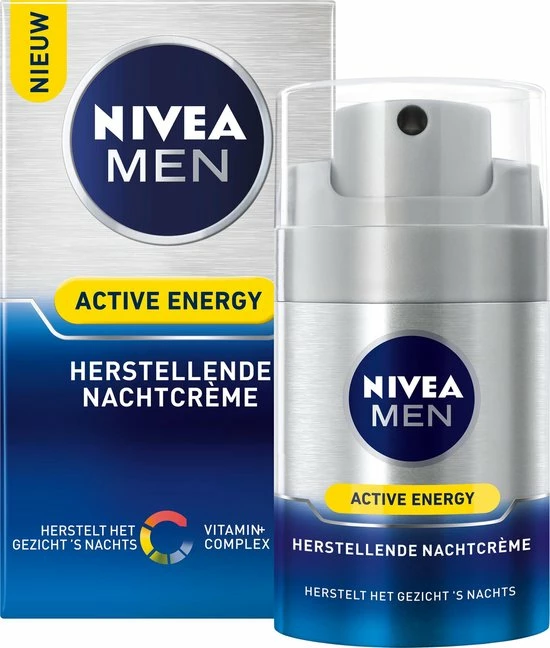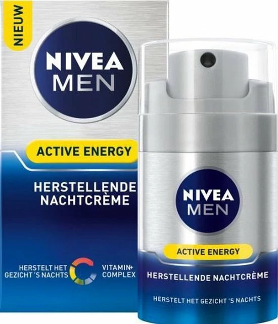 NIVEA MEN ACTIVE ENERGY HERSTELLENDE NACHTCRÈME. Net als je lichaam heeft je huid dagelijks energie en vitaminen nodig. Daarom heeft NIVEA MEN een innovatieve gezichtscrème ontwikkeld die je huid herstelt gedurende de nacht. De formule met Vitamin+ Complex is gedurende de hele nacht actief en ondersteunt het herstel van de huid voor een fitte en gezond uitziende huid in de ochtend.