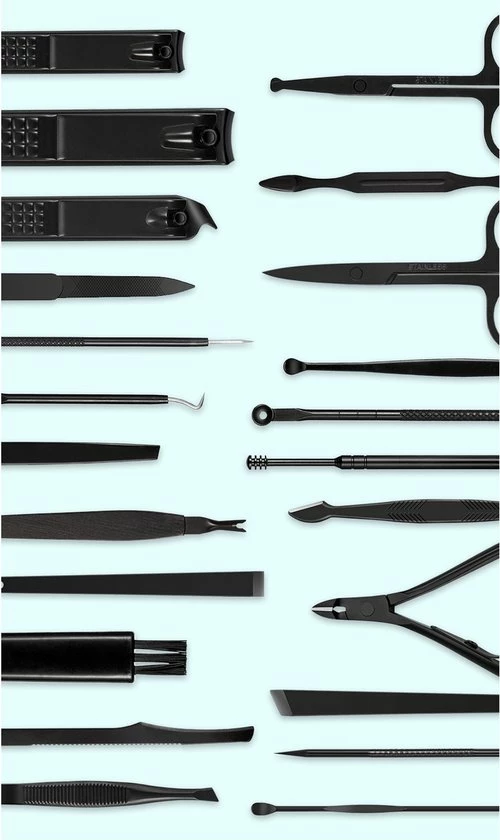 De set bestaat uit 26 elementen, elegant en duurzaam ontwerp van elk van de gereedschappen, samen met de behuizing zorgt voor een lange levensduur. Het is ook een geweldig cadeau-idee. Binnen in de behuizing is er een aparte plaats voor elk gereedschap om de orde te houden zonder het te verliezen. De case is gesloten met een drukknoop en heeft een interessante zwarte structuur aan de buitenkant, die elke vrouw zal aanspreken.