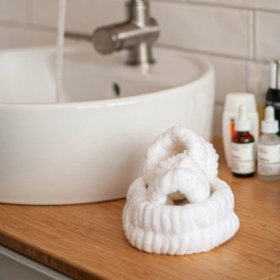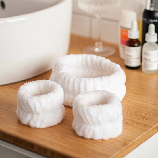 Onze waterabsorberende Skincare Scrunchie Set voorkomt de frustratie van water dat langs je armen druipt, in je mouwen glijdt en je haren die nat worden bij het reinigen van je gezicht.