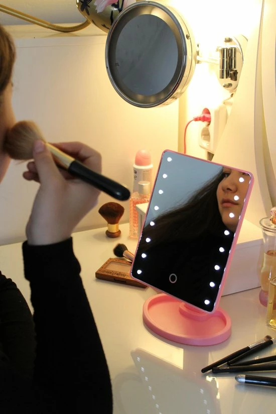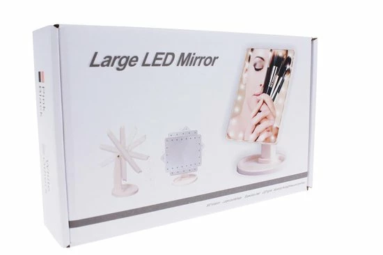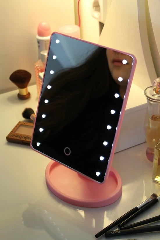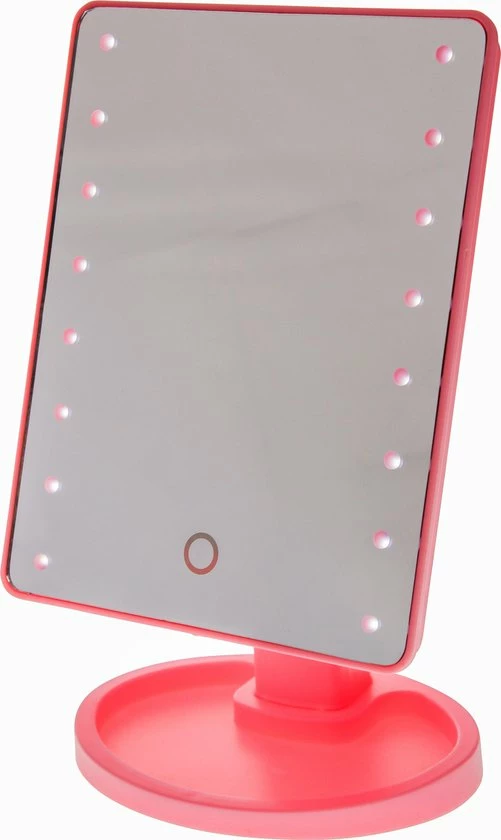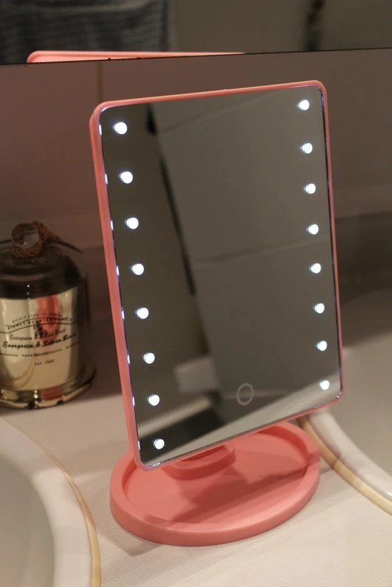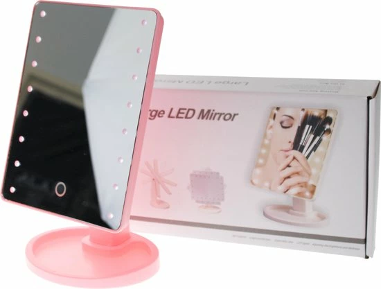 Voor de diva’s en schoonheidskoninginnen is deze mooie spiegel een hele uitkomst. De spiegel is roze en heeft 16 LED-lampjes die zorgen voor de perfecte verlichting bij het aanbrengen van make-up of het inbrengen van lenzen. De spiegel heeft een tafelstandaard en is verstelbaar tot 180 graden. Hij werkt op 4 AA-batterijen die niet inbegrepen zijn.
