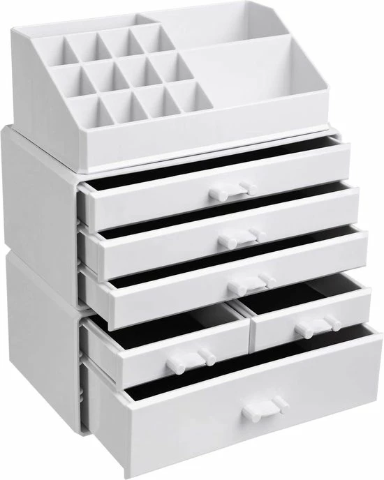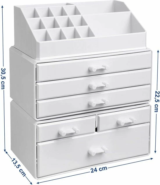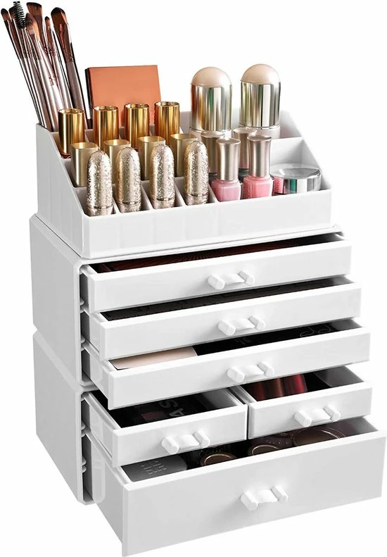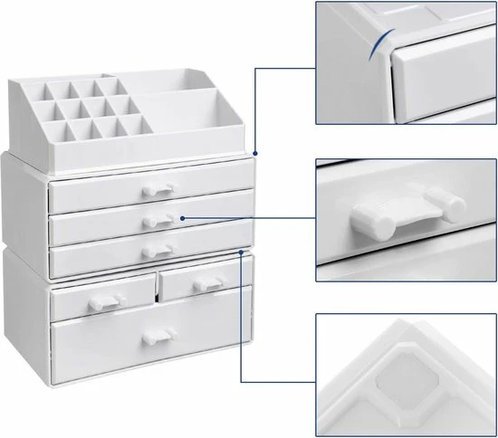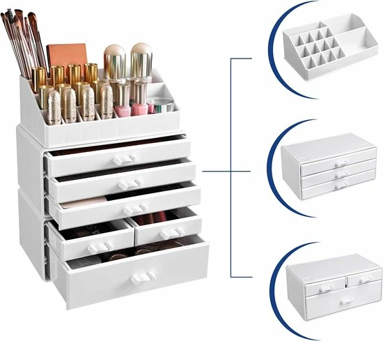Stapelbaar en afneembaar: de 3 afzonderlijke delen van deze cosmetische behuizing zijn samen gestapeld, wat betekent dat u het in verschillende vormen kunt losmaken en in uw badkamer, slaapkamer of overal waar u wenst te plaatsen; Bovendien kunt u ook meer eenheden kopen en ze samenstellen om te voldoen aan een grotere opslagbehoeften